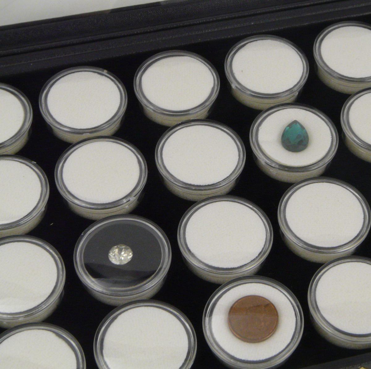 2a) Coffret pierres taillées vitré, 24 boites rondes plastique