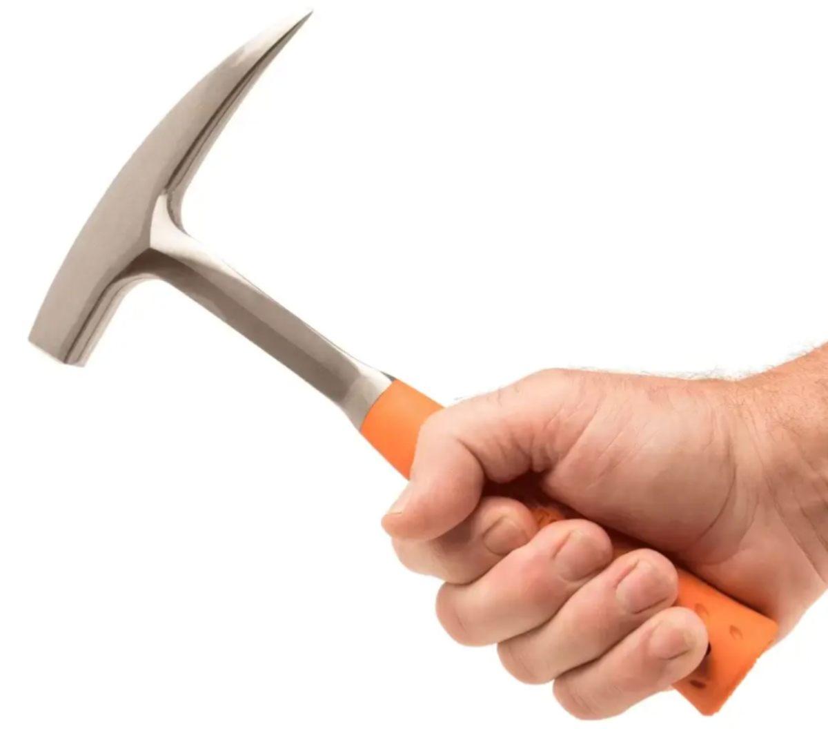 🔨 Marteau/pic à pierre en métal poli avec une poignée en nylon orange, conçu pour offrir une excellente prise en main.