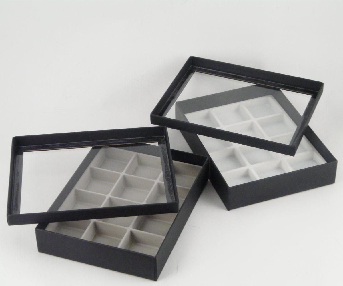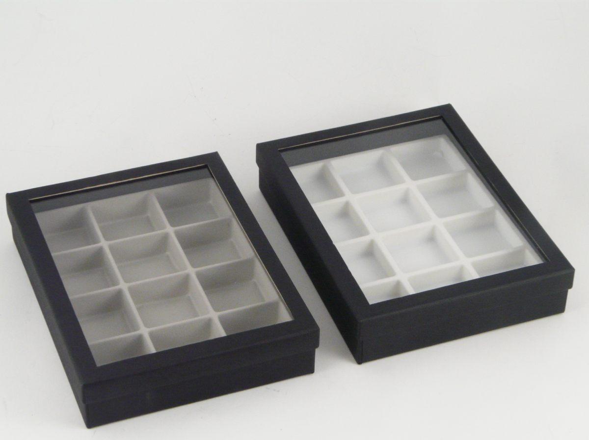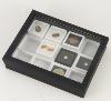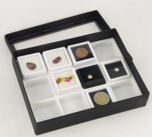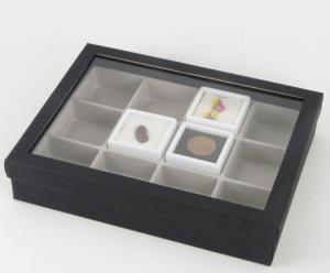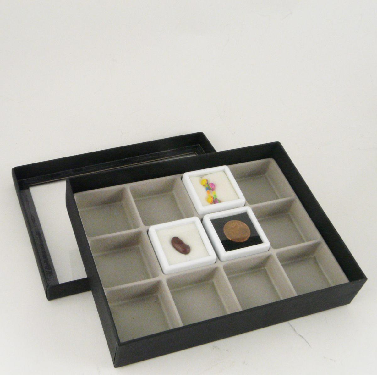 Coffret - plateaux de présentation avec 12 casiers 4x4 cm pour rangement de collections.