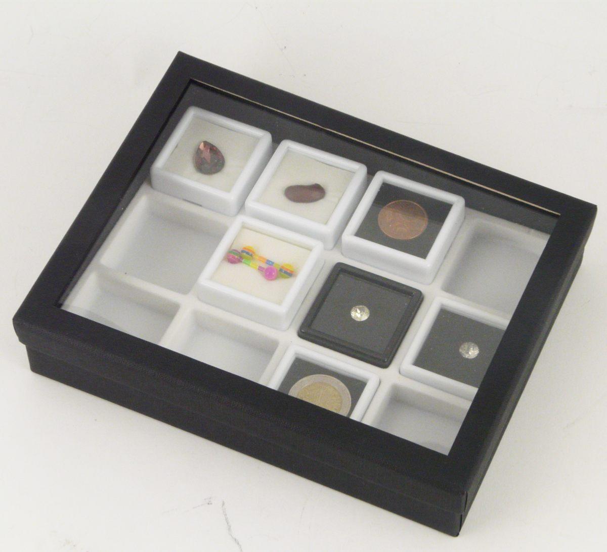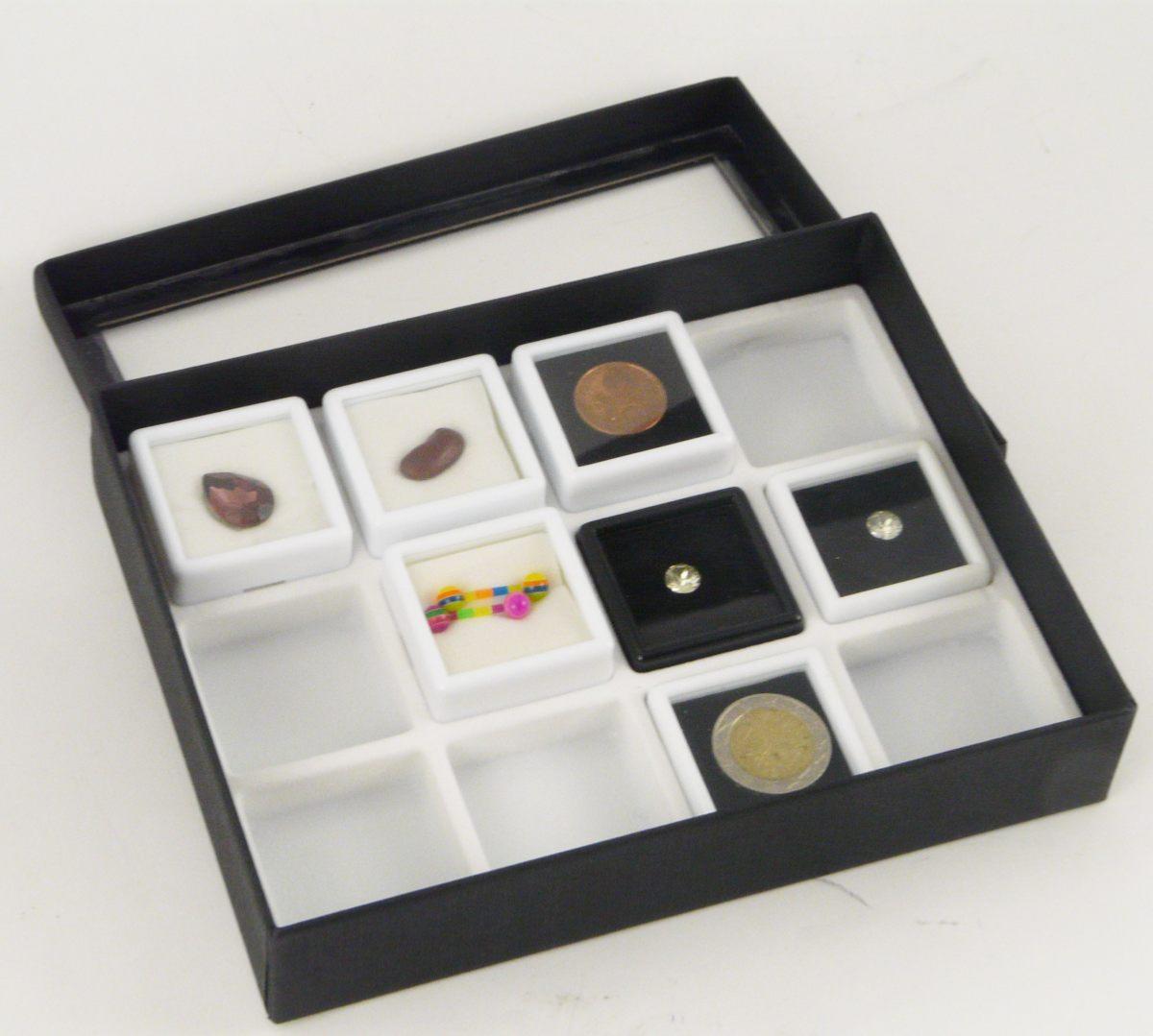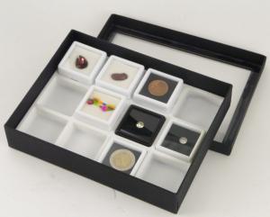 L’intérieur du coffret est aménagé avec un plateau en plastique fin et léger, spécialement conçu pour organiser efficacement son contenu. Il est divisé en 12 compartiments de 4 x 4 cm, permettant de ranger et de séparer soigneusement de petits objets afin d’éviter tout contact ou mélange. Ces casiers permettent aussi de ranger des boites de gemmologie (normale ou haute) de 4x4 cm. Cette disposition est idéale pour exposer et protéger des collections variées.